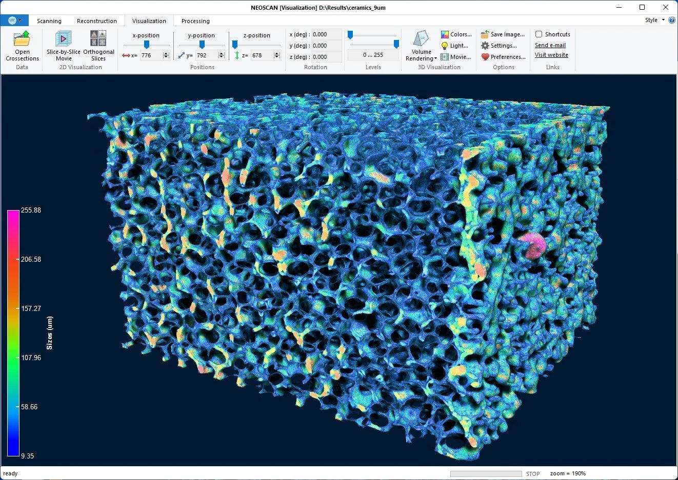 GPU-accelerated 2D/3D image analysis allows obtaining numerical data from an object’s morphology. In any single slice, it can calculate the area/perimeter/size/roundness of all objects. The results are combined into a colour-coded histogram and into a report of total and average values, such as porosity, total and average area and perimeter of objects and others. 3D Analysis results can be saved to text files and as pictures of calculated colour-coded distributions. The local size of the object(s) is calculated by inflating spherical probes at every object’s point. 3D morphological analysis creates a colour-coded volume according to the object’s calculated numerical values. This colour-coded volume can be combined with the object’s morphology in the volume rendering.