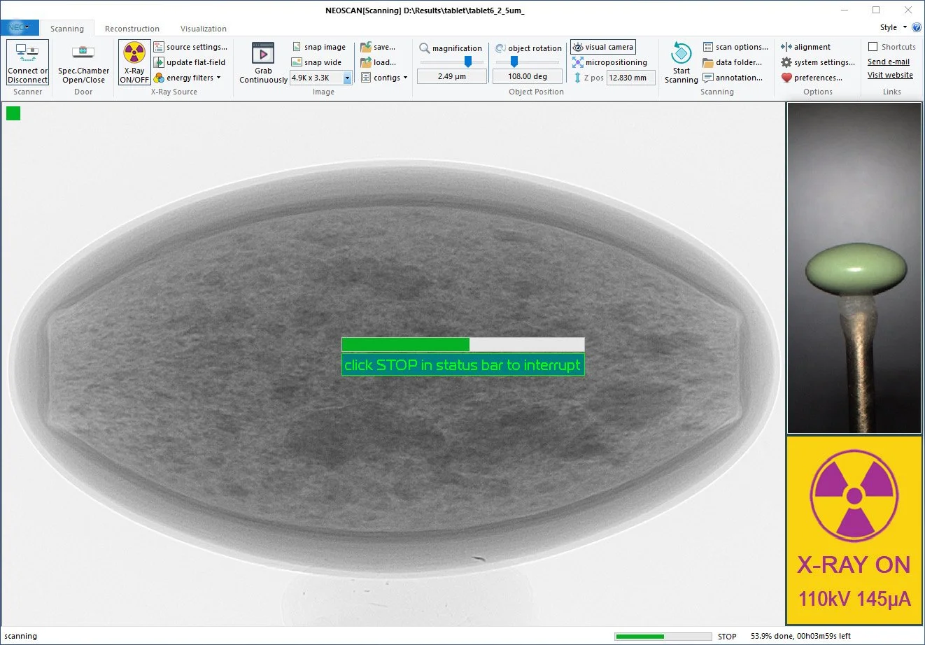 Starting from the left, establish communication with your scanner, open the specimen chamber and install an object. Next, start the X-ray source with a manual or automatic selection of energies and filtering optimal for your object. Now simply launch your scan! Manually choose a file name, data location and scan settings, or scan automatically to subfolders with an incremental index for studies of multiple samples using identical settings.